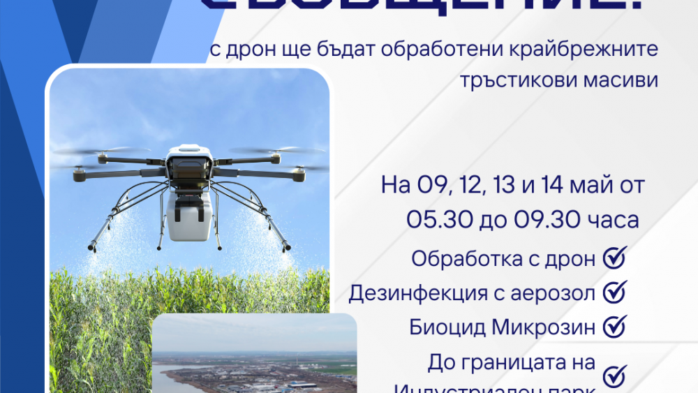 На 09, 12, 13 и 14 май от 05.30 до 09.30 часа с дрон ще бъдат обработени крайбрежните тръстикови масиви на езерото Вая - около кварталите „Горно Езерово“ и „Долно Езерово“, „Лозово“, ул. „Крайезерна“ (по границите на "Индустриален парк") и бул. „Тодор Александров“.