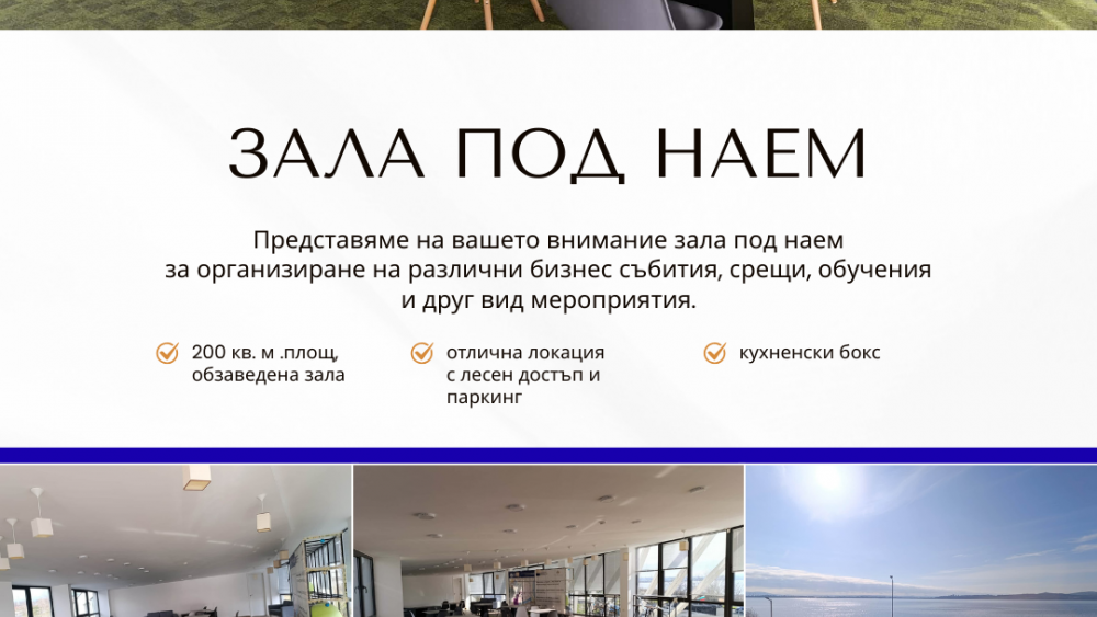 Организирайте своето следващо събитие в просторната ни зала от 200 кв.м – модерна, светла и с прекрасен изглед! Намира се на ул. "Крайезерна" 155 и предлага уютна обстановка, комфортно обзавеждане, кухненски бокс и осигурен безплатен паркинг. Отличен избор за корпоративни събития, обучения, тиймбилдинги и креативни срещи, като предоставя идеални условия за презентации, фирмени мероприятия, семинари и обучения.